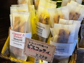 ●名称:ビスコッティ(ドライフルーツ)●原材料名:小麦粉(国産)、砂糖(国産)、卵黄(国産)、ドライフルーツ(輸入)、オリーブオイル(国産)、ラム酒(輸入)